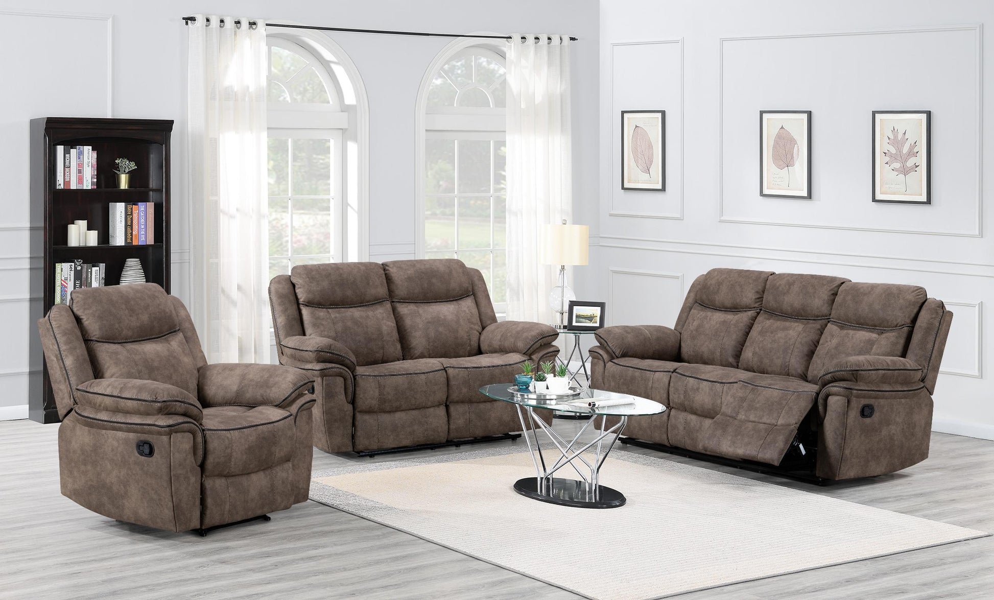The Lucan 3 Seater comes with a manual recliner, in a soft brown leatherair fabric with black piping detail.