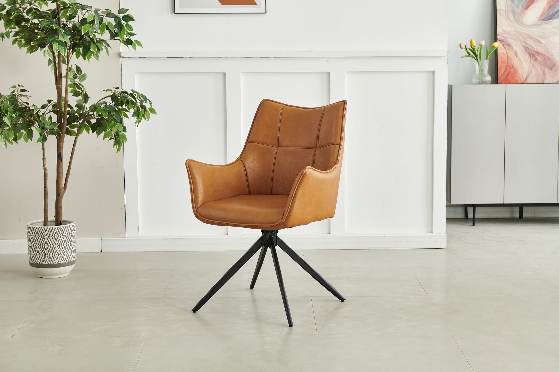 Exquisitely versatile and presenting a contemporary twist on the traditional wing back armchair, the Vito dining chair is a real statement piece. Beautifully tailored in a heavy grain faux leather with cross stitch pattern, it is designed to be enjoyed anyway you need, a part of your dining set or as an occasional chair. Legs finished in black powder-coating.